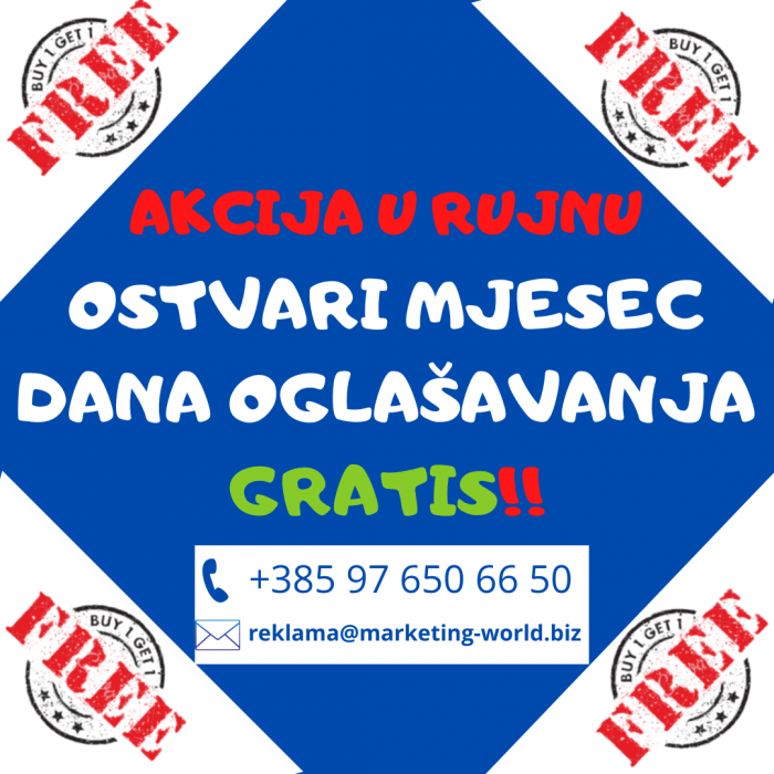 Marketing World napravio je akciju za sve koji se žele reklamirati na drugačiji način. Za sve koji se odluče tokom ovog mjeseca ugovoriti reklamiranje putem LCD panela koji su postavljeni po gradu i okolici darujemo mjesec dana reklamiranja GRATIS. Regularna cijene jedne pozicije je 500kn/mj no sada dajemo mjesec dana gratis. Trenutno ukupno imamo 26 pozicija te se konstantno širimo i tražimo nove lokacije. Sve lokacije se nalaze na ferkventnim mjestima gdje prolazi puno ljudi.